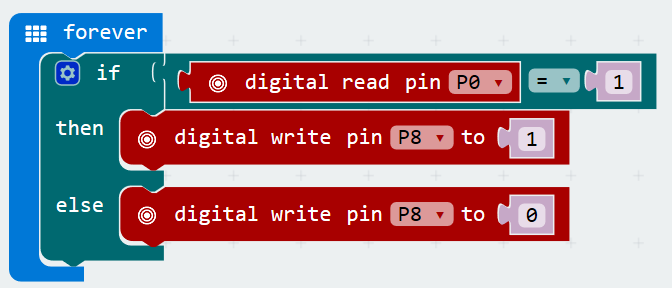 連線圖: 將按鈕模組連接至micro:bit擴充板P0腳位,LED燈模組連接至micro:bit擴充板P8腳位。