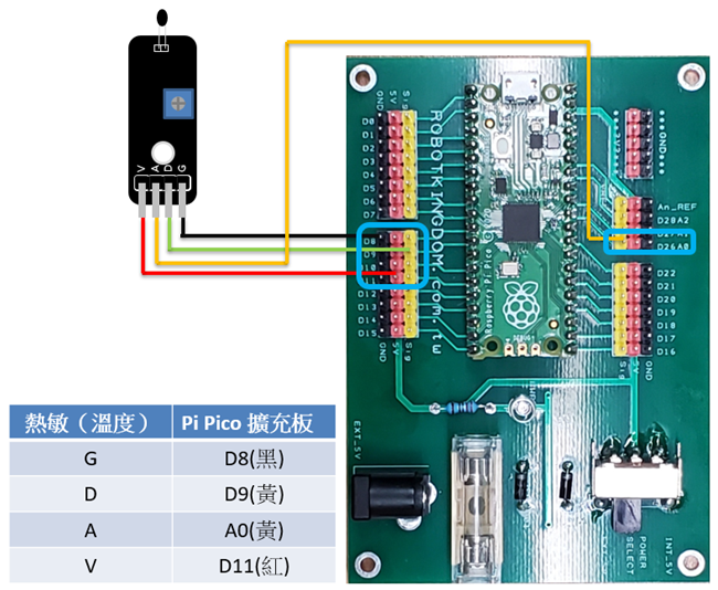 > 熱敏（溫度）模組是數位/類比訊號輸出， 可以接「D0 \~ D28、A0 \~ A2」的Raspberry Pi Pico擴充板訊號端上。 本範例連接到「D7」、「A0」。