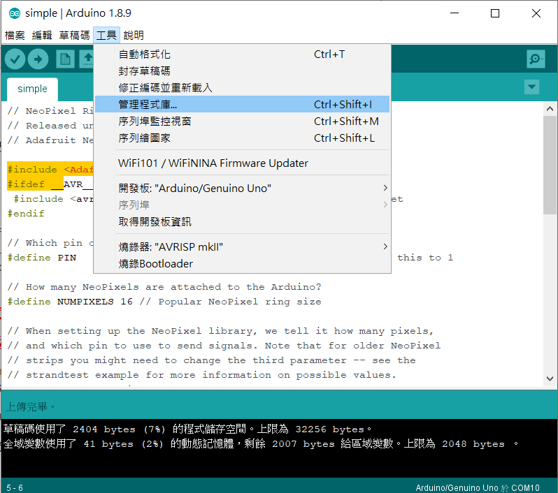 在Arduino上選擇工具,選擇管理程式庫,在管理程式庫搜尋HCSR04選擇HCSR04 ultrasonic sensor by gamegine版本2.02並安裝。